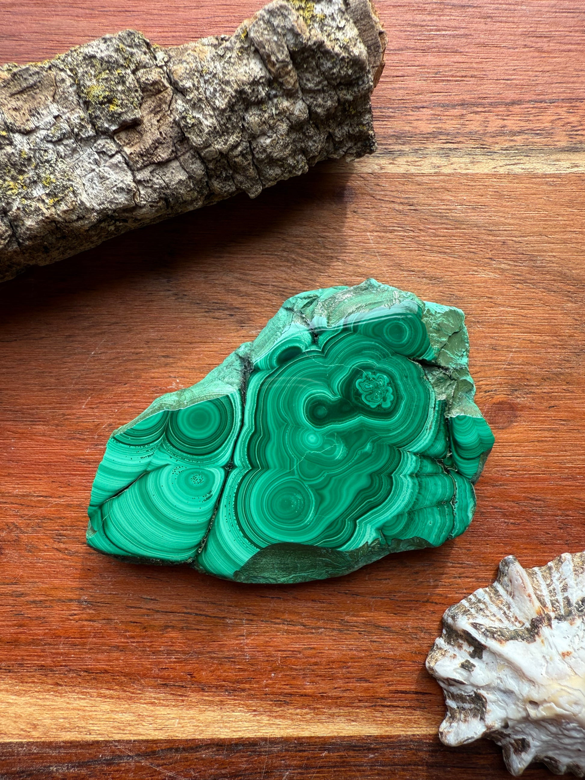 Malachite is a powerful & transformative stone known for its deep green hues & strong connection to the heart chakra.