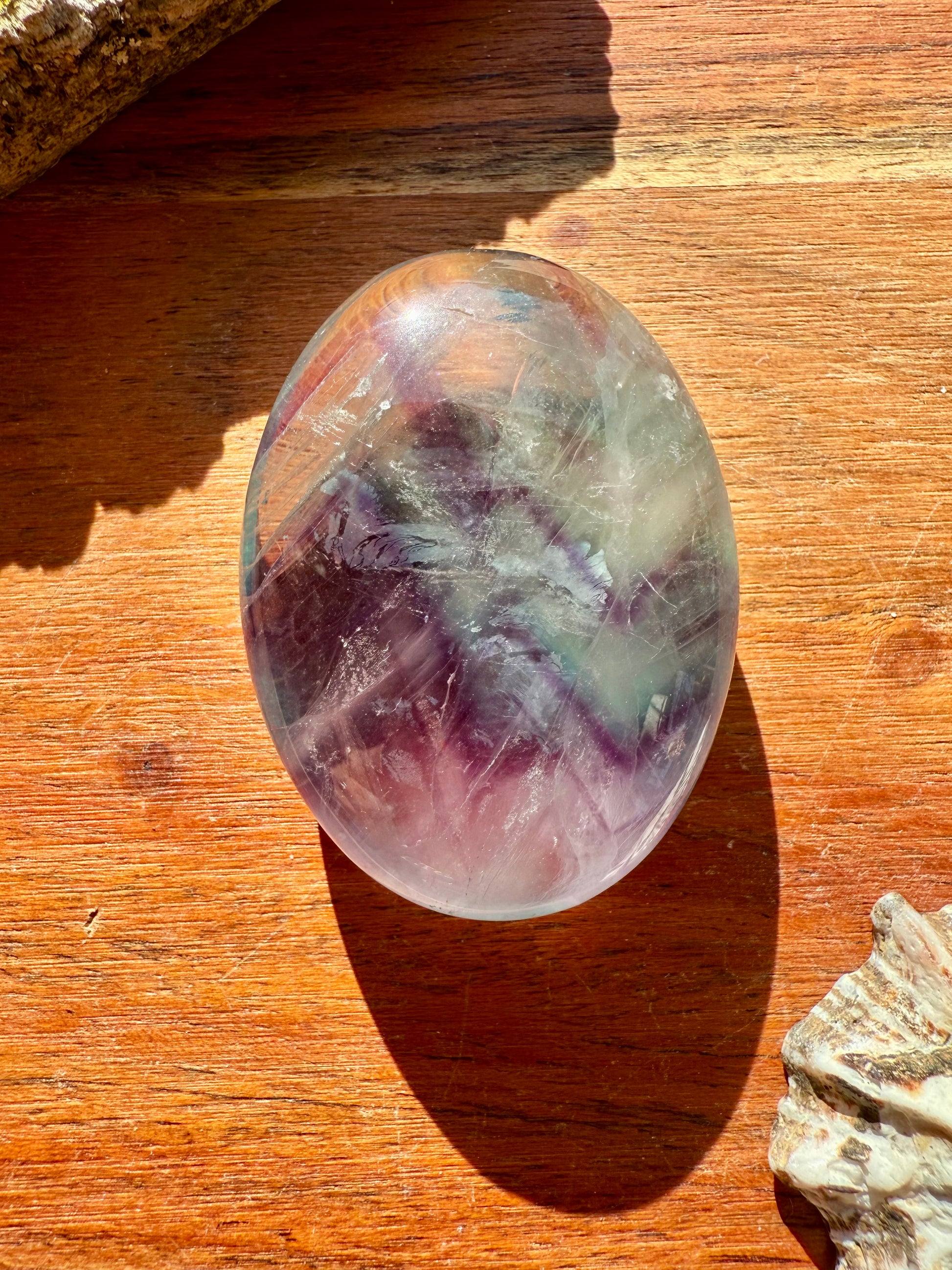 Rainbow fluorite is a highly harmonizing and protective stone known for its vibrant bands of color and ability to balance the mind, body, and spirit. It enhances mental clarity, focus, and decision-making while soothing stress and clearing negative energy from the aura.