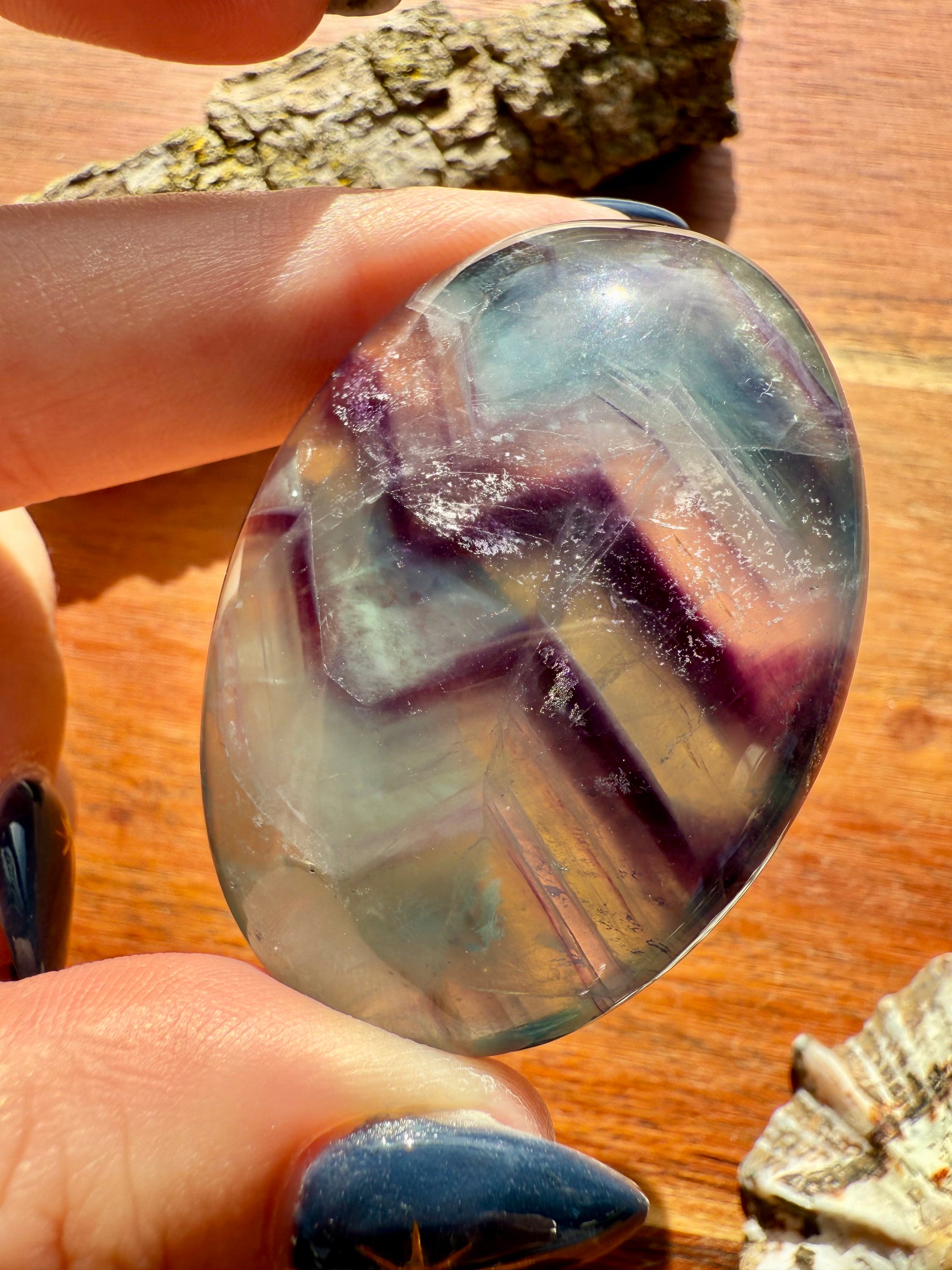 Rainbow fluorite is a highly harmonizing and protective stone known for its vibrant bands of color and ability to balance the mind, body, and spirit. It enhances mental clarity, focus, and decision-making while soothing stress and clearing negative energy from the aura.