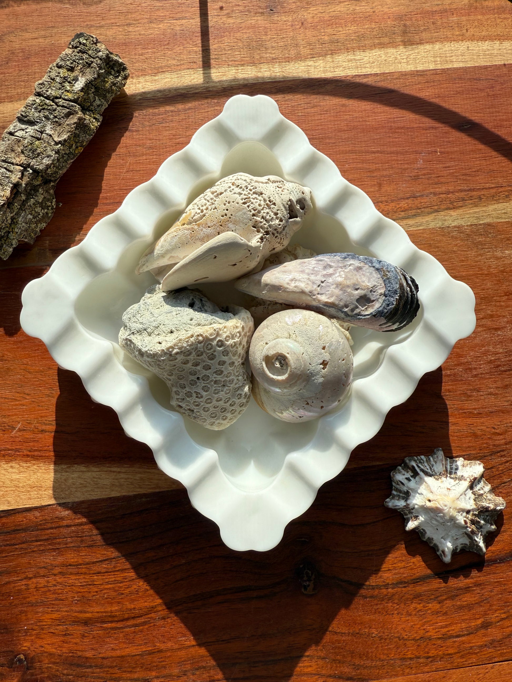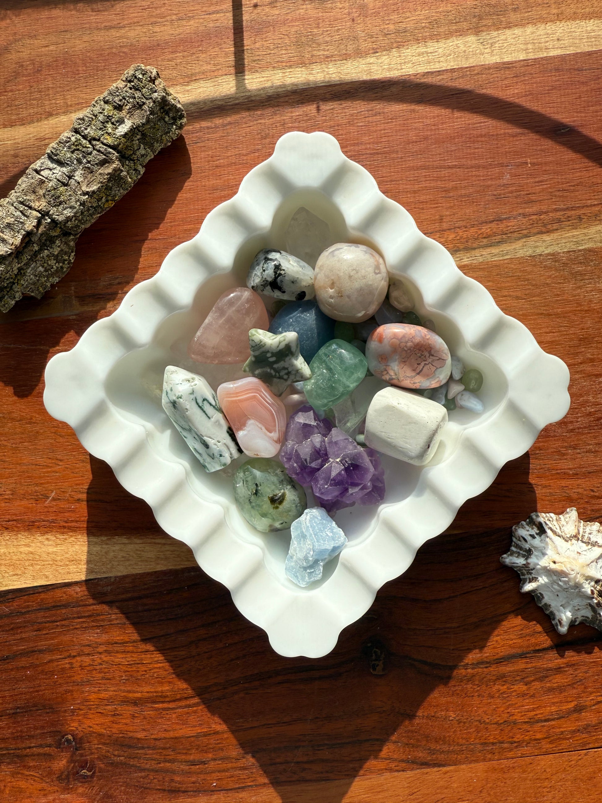 Fun little milk glass dish - perfect for crystal scoops, tumbles or herbs!